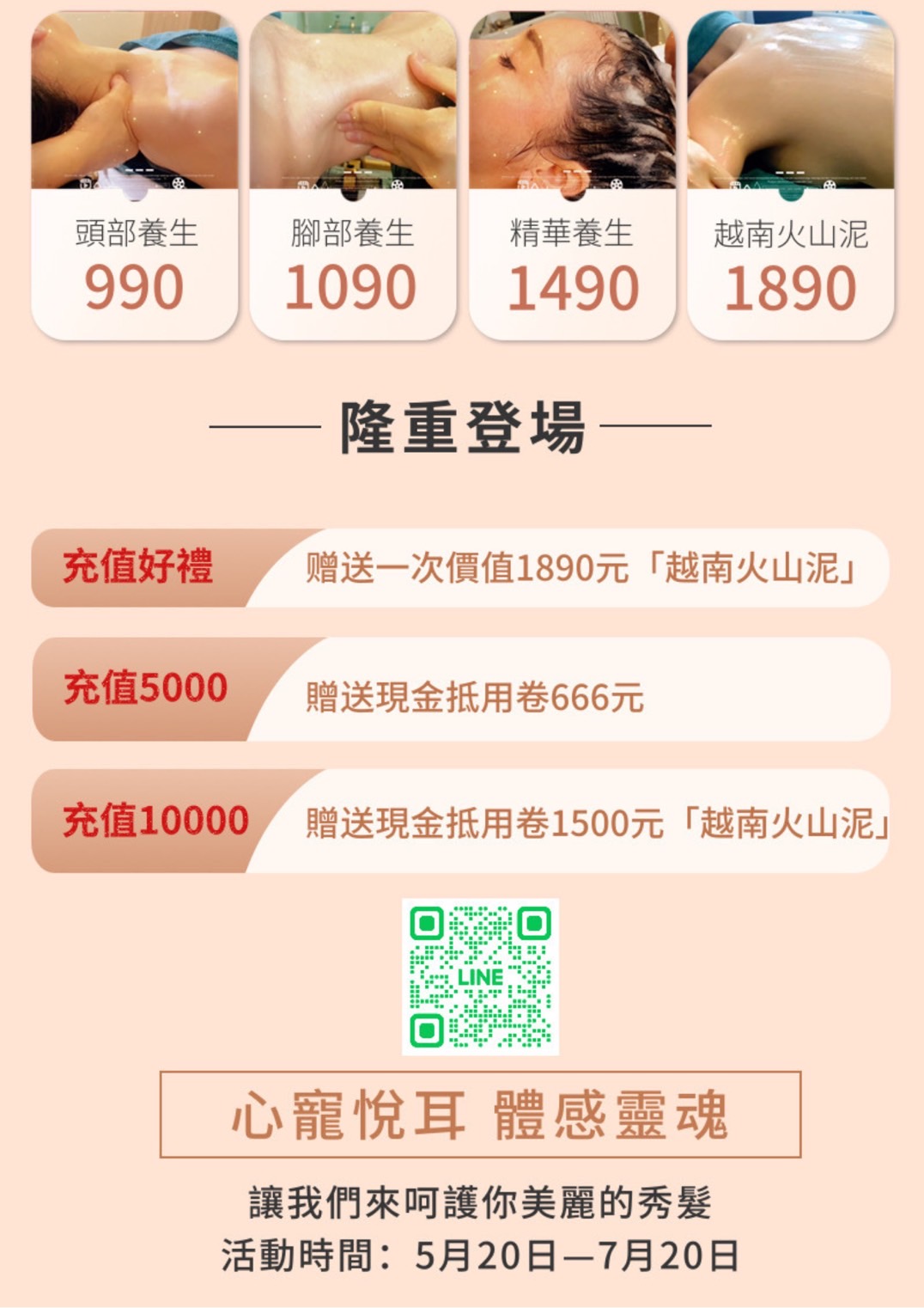 體驗越式洗髮療程,享受百分之百純天然植物油的呵護,沉浸在慵懶舒緩的氛圍中。溫暖柔和的燈光、合宜的室內溫度,營造出最舒適的環境,讓您完全放鬆。
